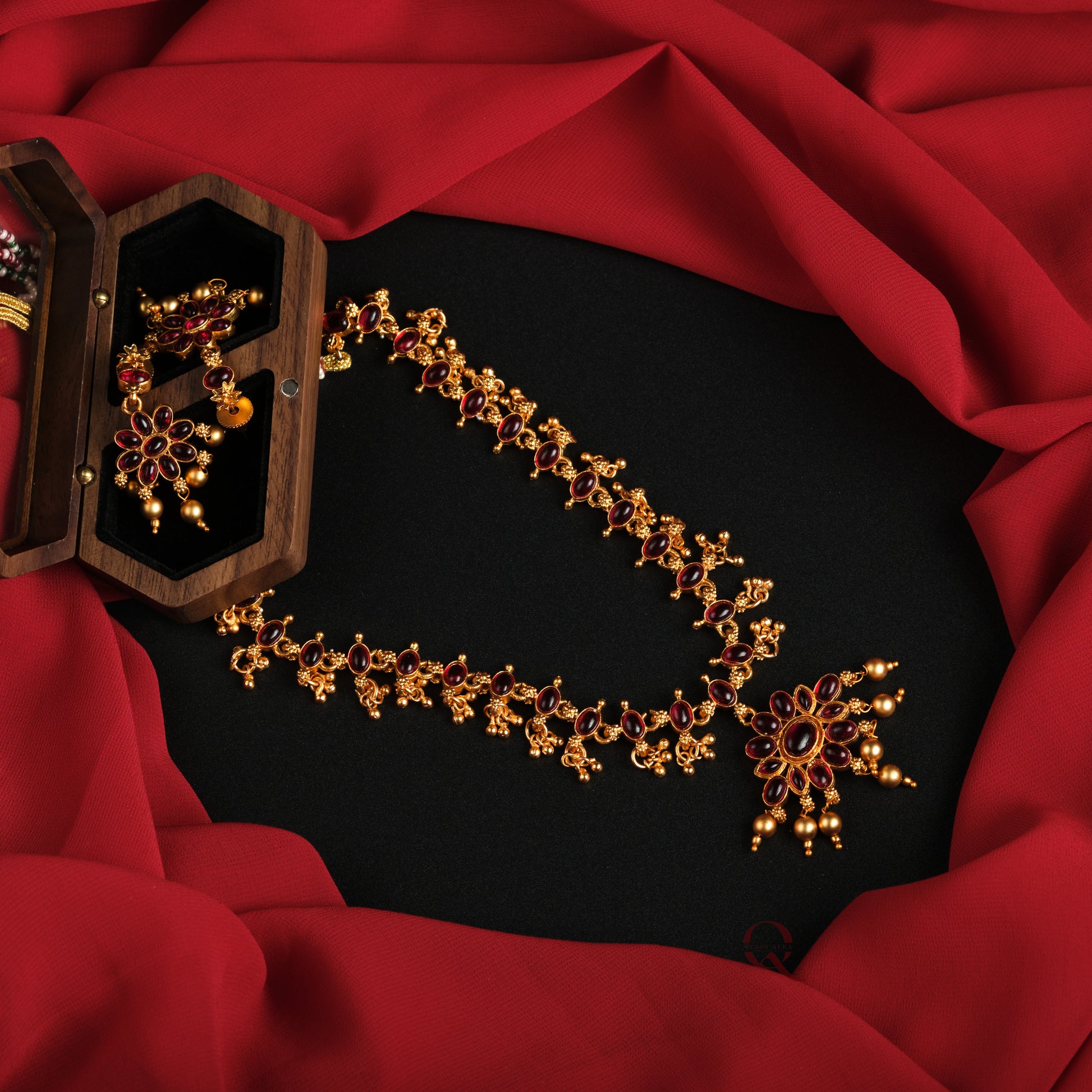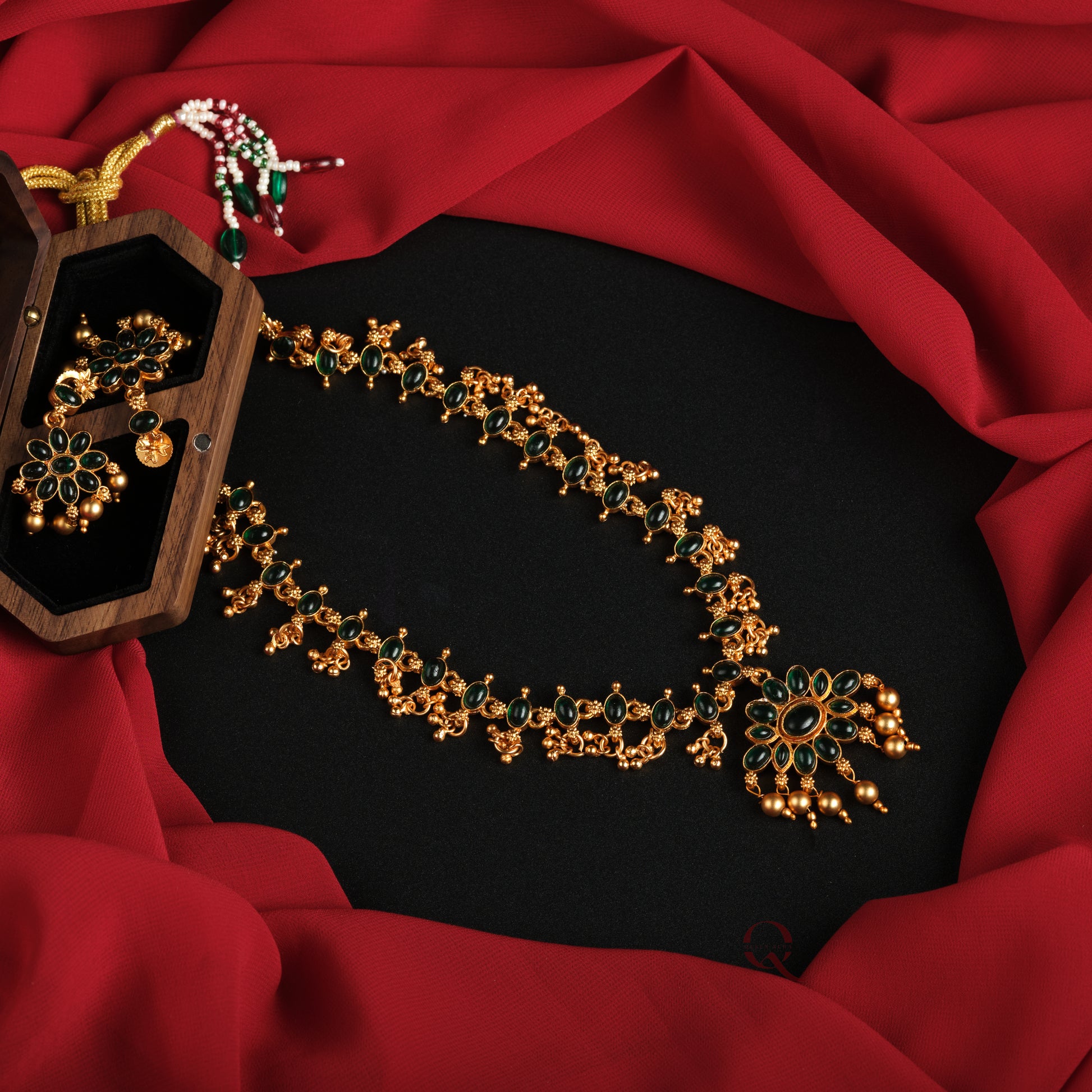 Elevate your festive ensemble with the Double Sided Necklace Set, featuring a versatile design that showcases vibrant red and green sides. This set includes a double-sided necklace paired with matching double-sided earrings, allowing you to effortlessly switch between colors to complement your celebration attire.