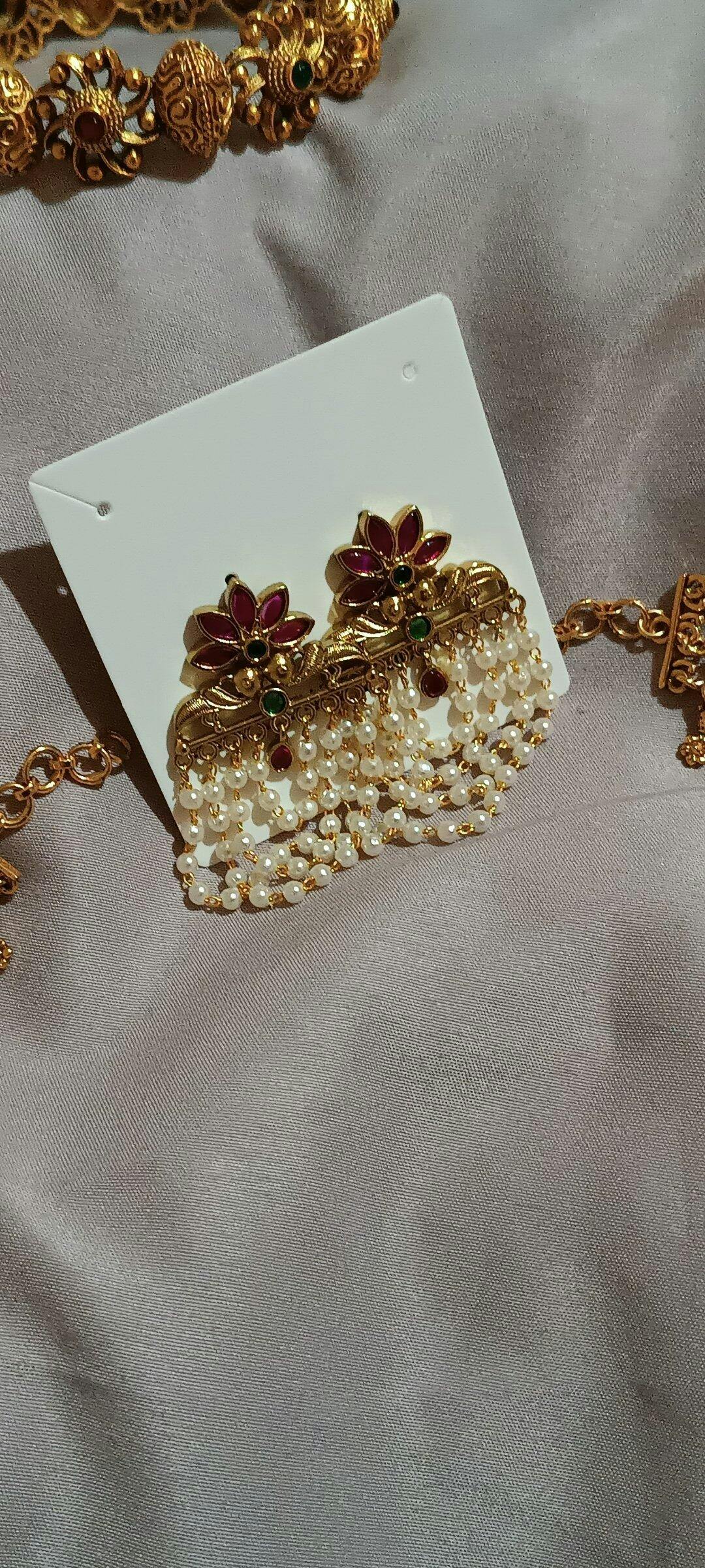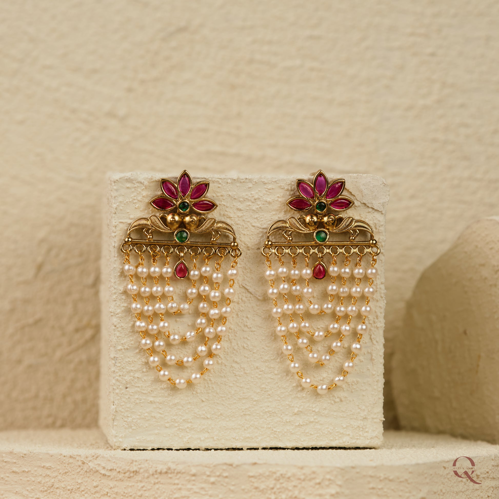 Elevate your ethnic look with the Flower Jhumka, featuring elegant flower designs and delicate pearl hangings. This beautifully crafted accessory adds a touch of grace and tradition, perfect for enhancing your festive and special occasion outfits. Comfortable to wear and visually striking, it complements a variety of ethnic styles with ease.