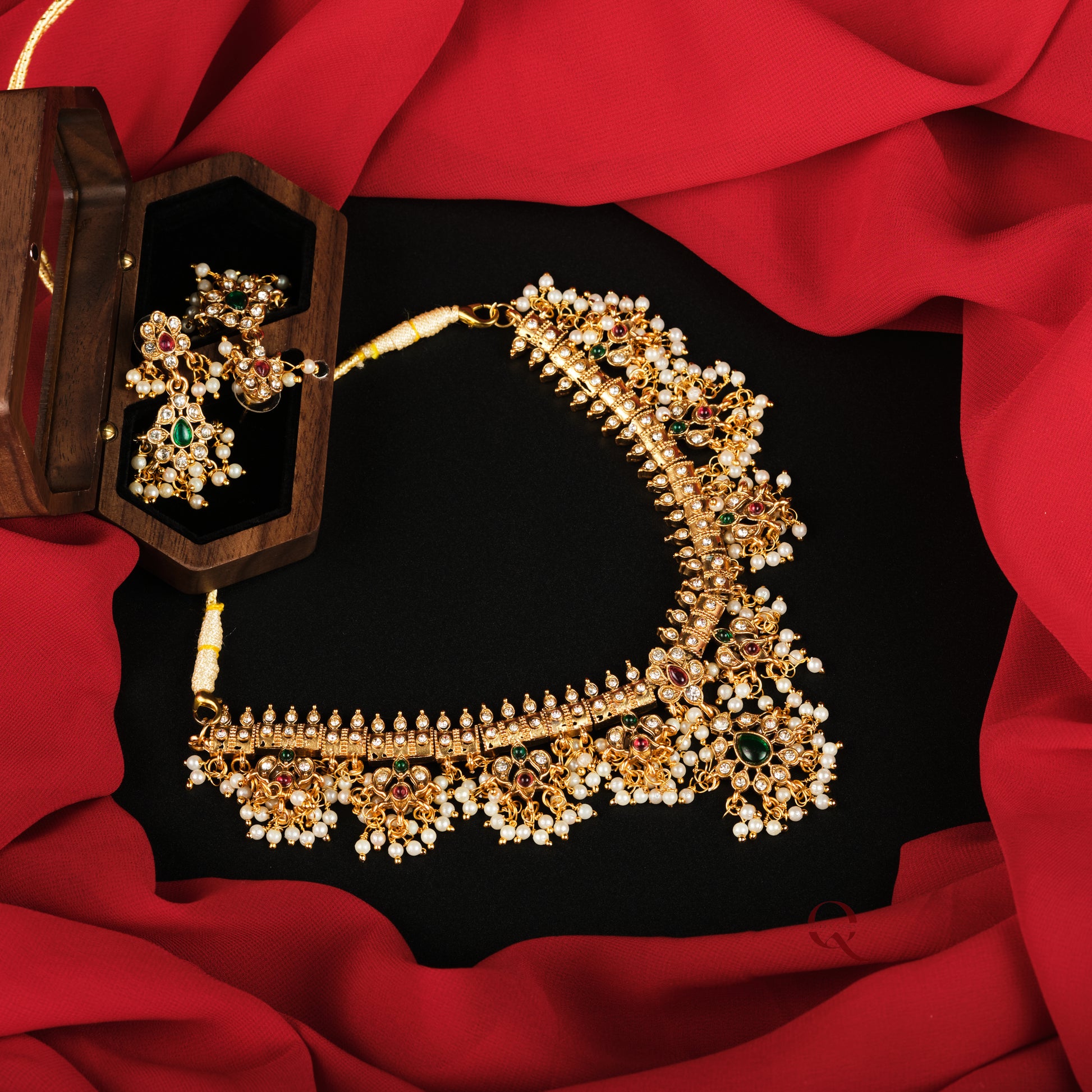 Elevate your festive attire with the Guttapusalu Short Haram, a stunning traditional necklace crafted to perfection. This exquisite piece showcases intricate guttapusalu work, reflecting expert craftsmanship and timeless elegance. Ideal for special occasions, it adds a rich cultural touch while enhancing your overall look with its classic design and detailed artistry. Perfect for those who appreciate heritage jewellery with a sophisticated appeal.