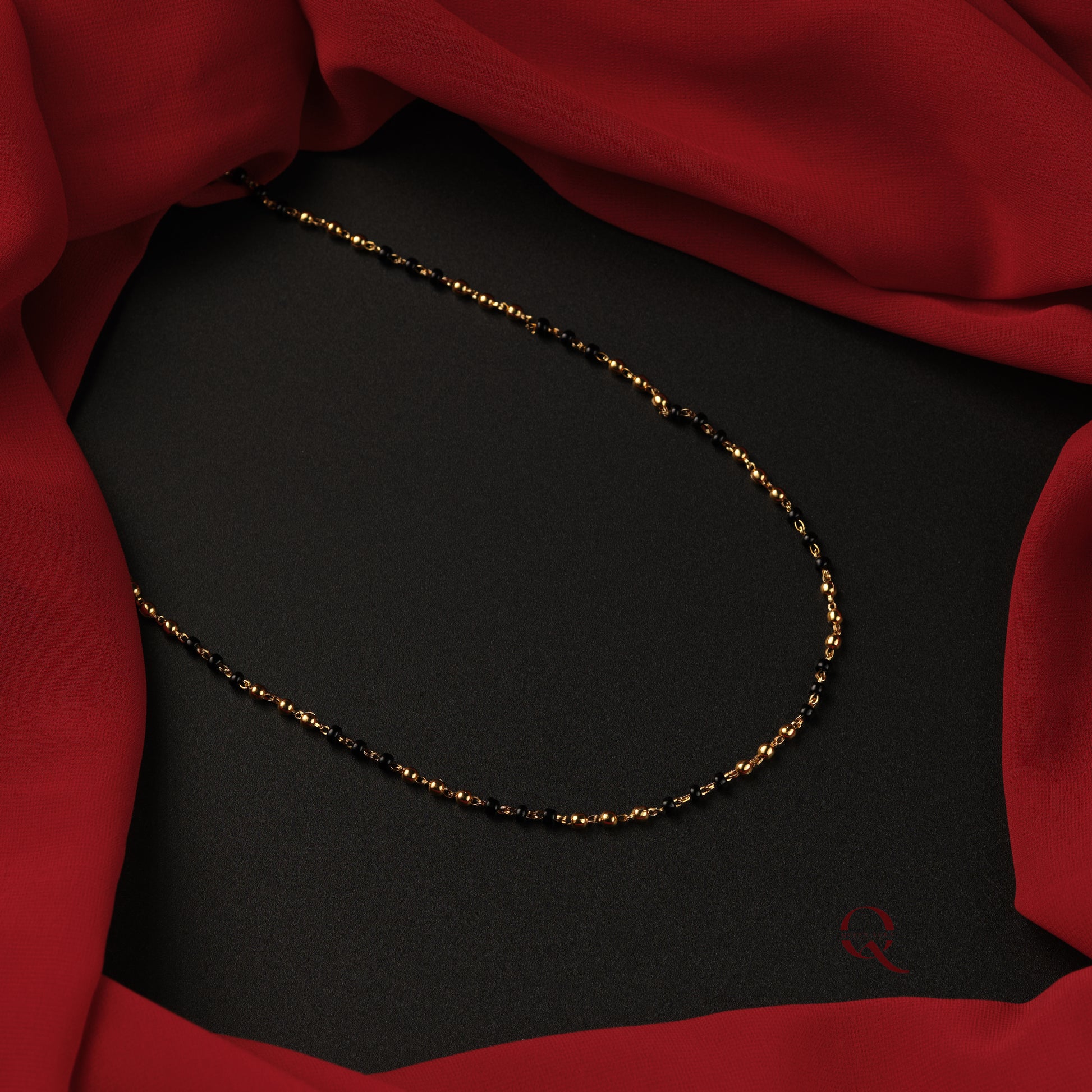 This Karimani Maala features a refined blend of black and golden beads, offering a timeless traditional aesthetic. Its simple yet elegant design makes it a versatile accessory, perfect for enhancing special occasion outfits with a touch of cultural sophistication.