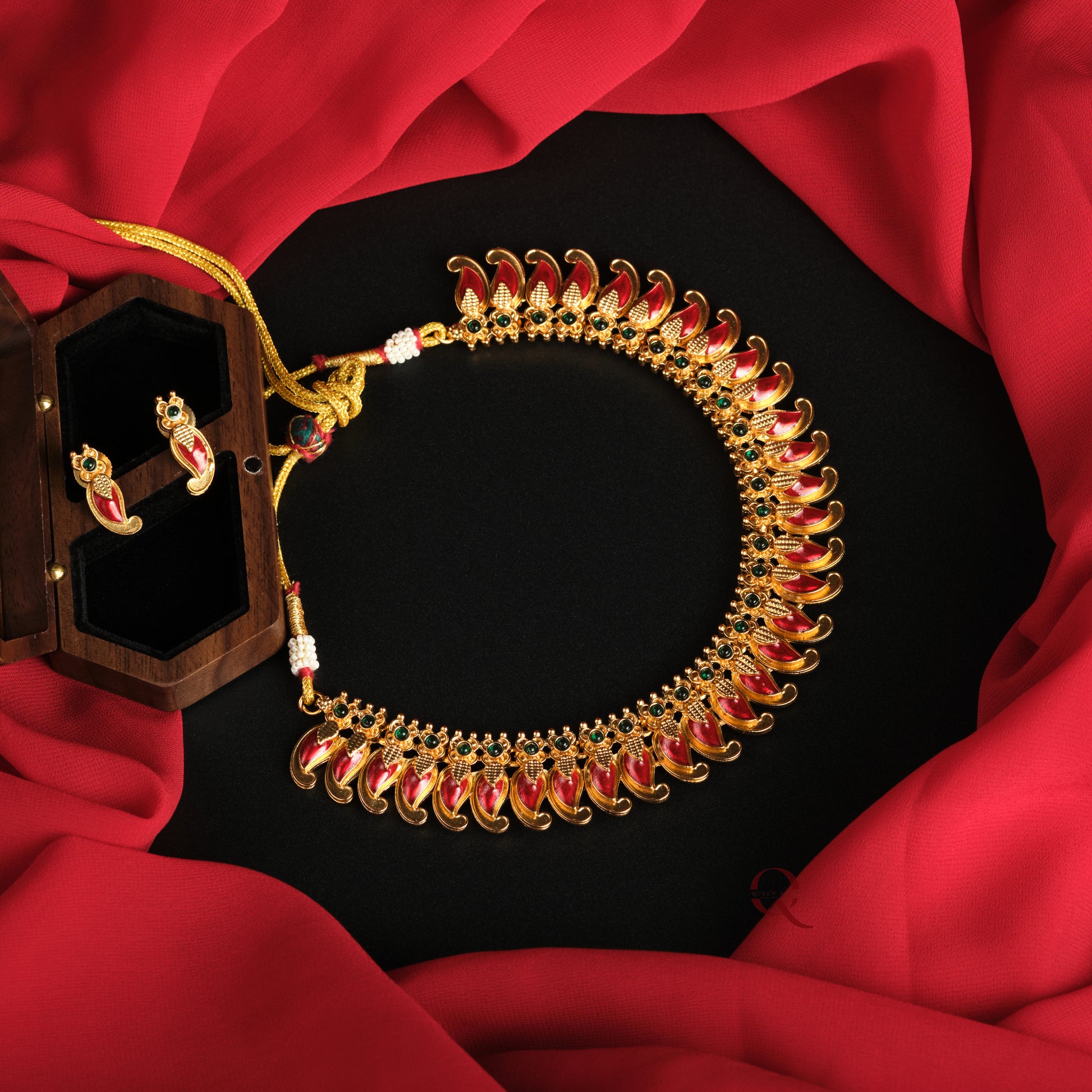 The Maanga Maala showcases traditional South Indian craftsmanship through its classic ethnic design. This necklace blends timeless aesthetics with cultural heritage, making it an ideal choice for those seeking authentic elegance. Expertly crafted, it complements traditional attire and enhances any occasion with its refined simplicity and heritage appeal.