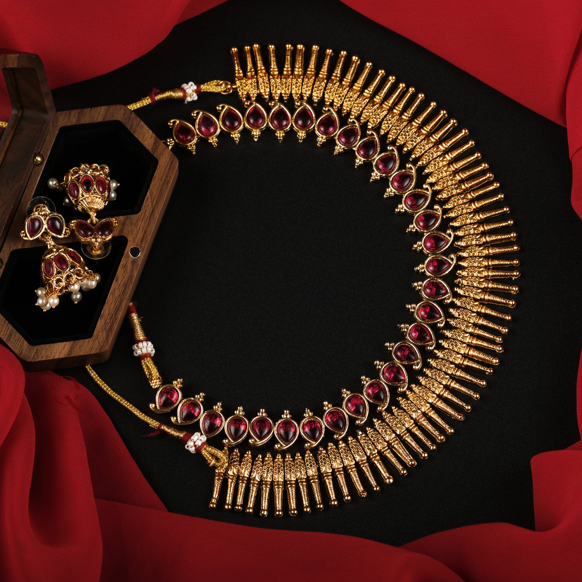 Elevate your festive and bridal ensembles with the Maanga Mullamottu Maala Combo Set. This exquisite set features a delicate pink Maanga Maala paired with a golden Mullamottu Maala, complemented by a matching pink Jhumka. Crafted to enhance traditional attire, it offers a harmonious blend of elegance and cultural richness, perfect for special occasions and celebrations.
