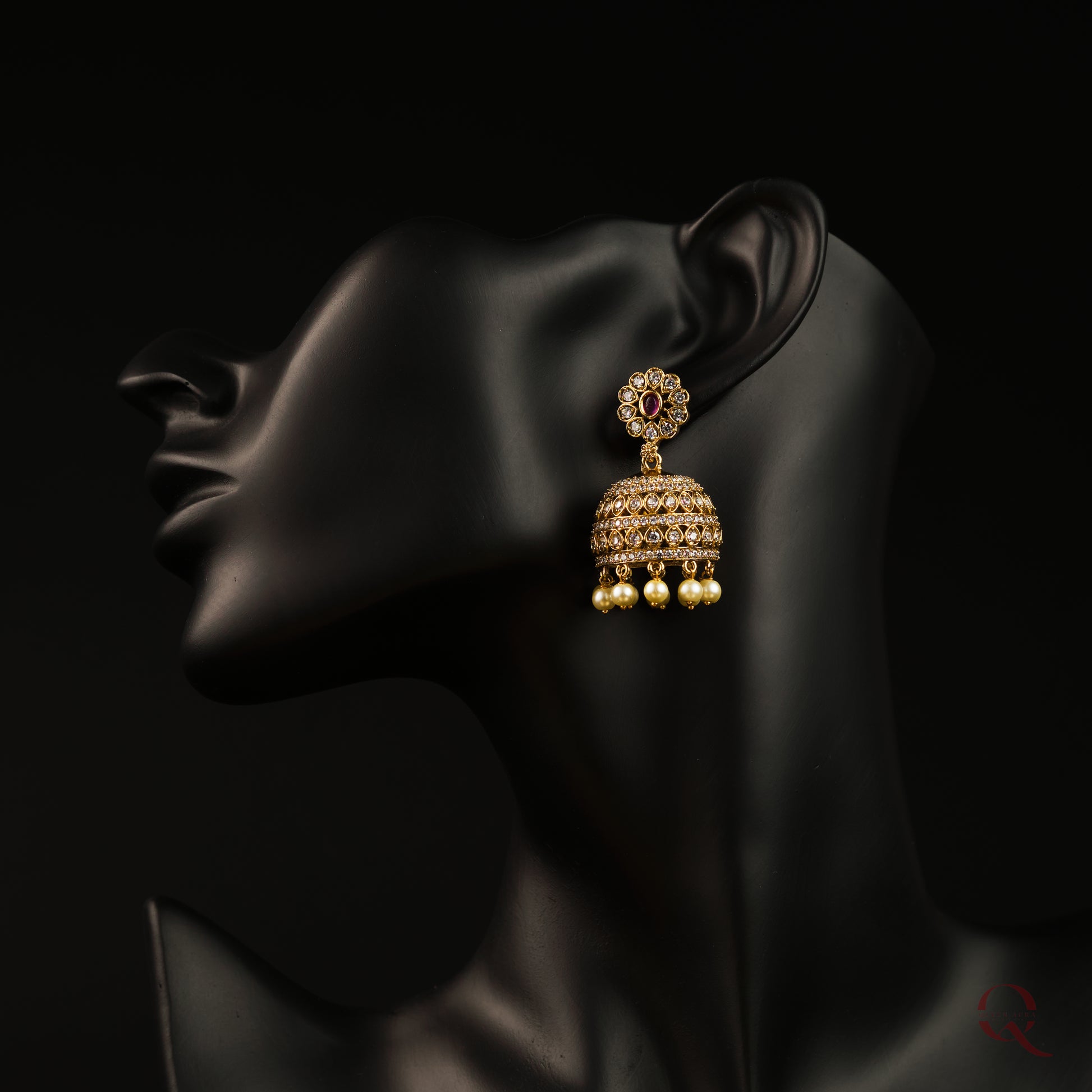 This Premium AD Jhumka showcases expert craftsmanship with its American diamonds set in an antique-inspired design. This elegant ethnic piece combines timeless beauty and intricate detailing, offering a sophisticated accessory that enhances traditional attire with subtle brilliance and refined charm. Ideal for those who appreciate heritage and luxury in their jewellery collection.