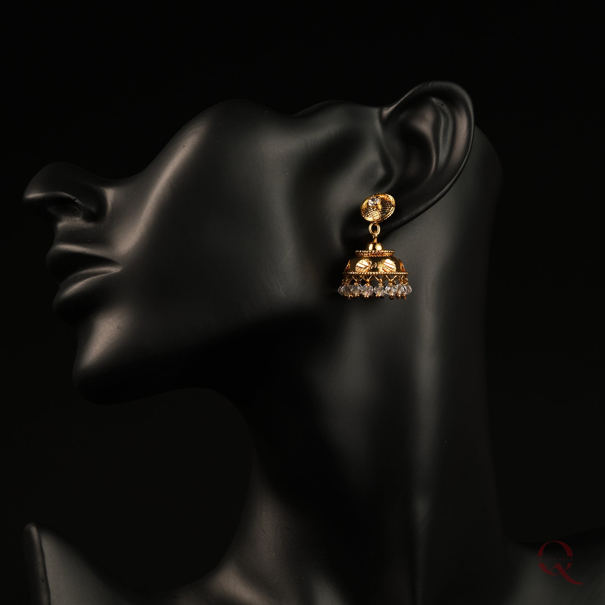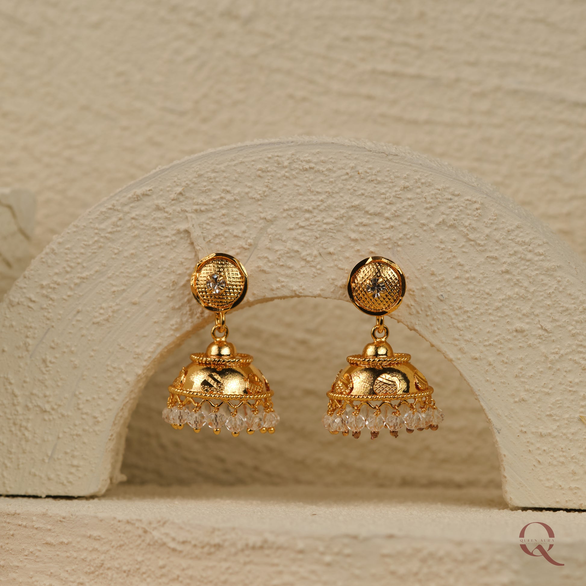 Elevate your jewellery collection with the White Crystal Stud Jhumka, featuring a sophisticated 2-in-1 design. This elegant piece combines classic stud simplicity with the intricate charm of jhumka hangings adorned with sparkling white crystals.